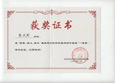 办公厅保健室张凤珍荣获市卫计委廉政感言创作活动一等奖——我院积极推进廉政感言创作征集活动